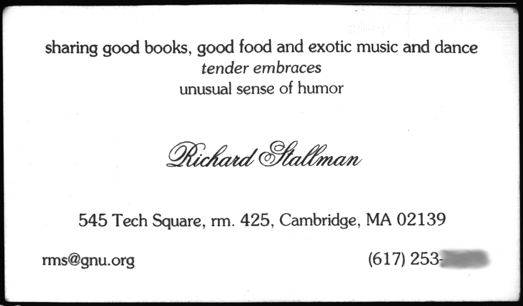 "Rozrywkowa" wizytówka Stallmana wręczona mi podczas wieczornego obiadu