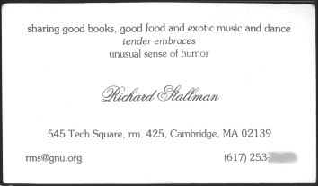 "Rozrywkowa" wizytówka Stallmana wręczona mi podczas wieczornego obiadu